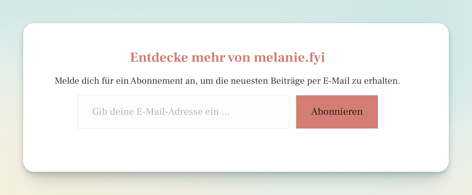 Für euch heißt das: Ihr könnt dieses Blog ab sofort abonnieren. Dafür müsst ihr einmal kurz einen Kommentar schreiben und die Checkbox darunter anhaken: Benachrichtige mich über neue Beiträge via E-Mail. Oder ihr lasst das mit dem Kommentar und packt eure E-Mailadresse einfach in diese schicke Box am Ende dieses Beitrags: